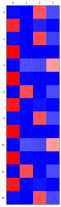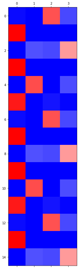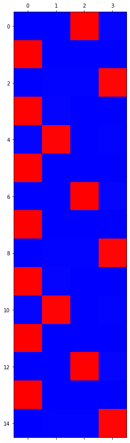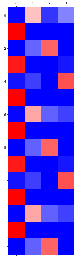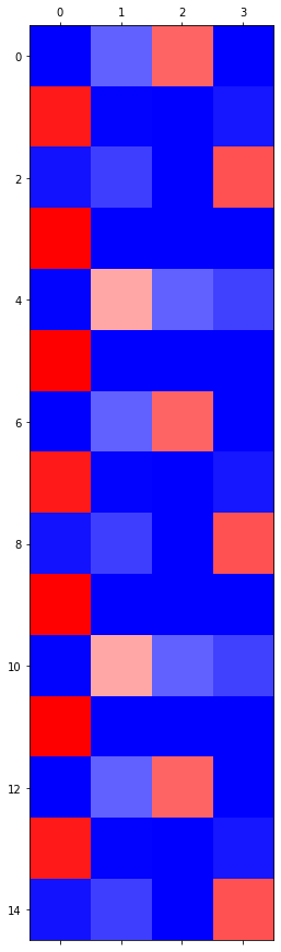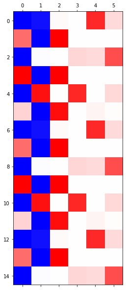 plt.matshow(yhat.data[-15:],cmap='bwr')<matplotlib.image.AxesImage at 0x7f09e935fa50>