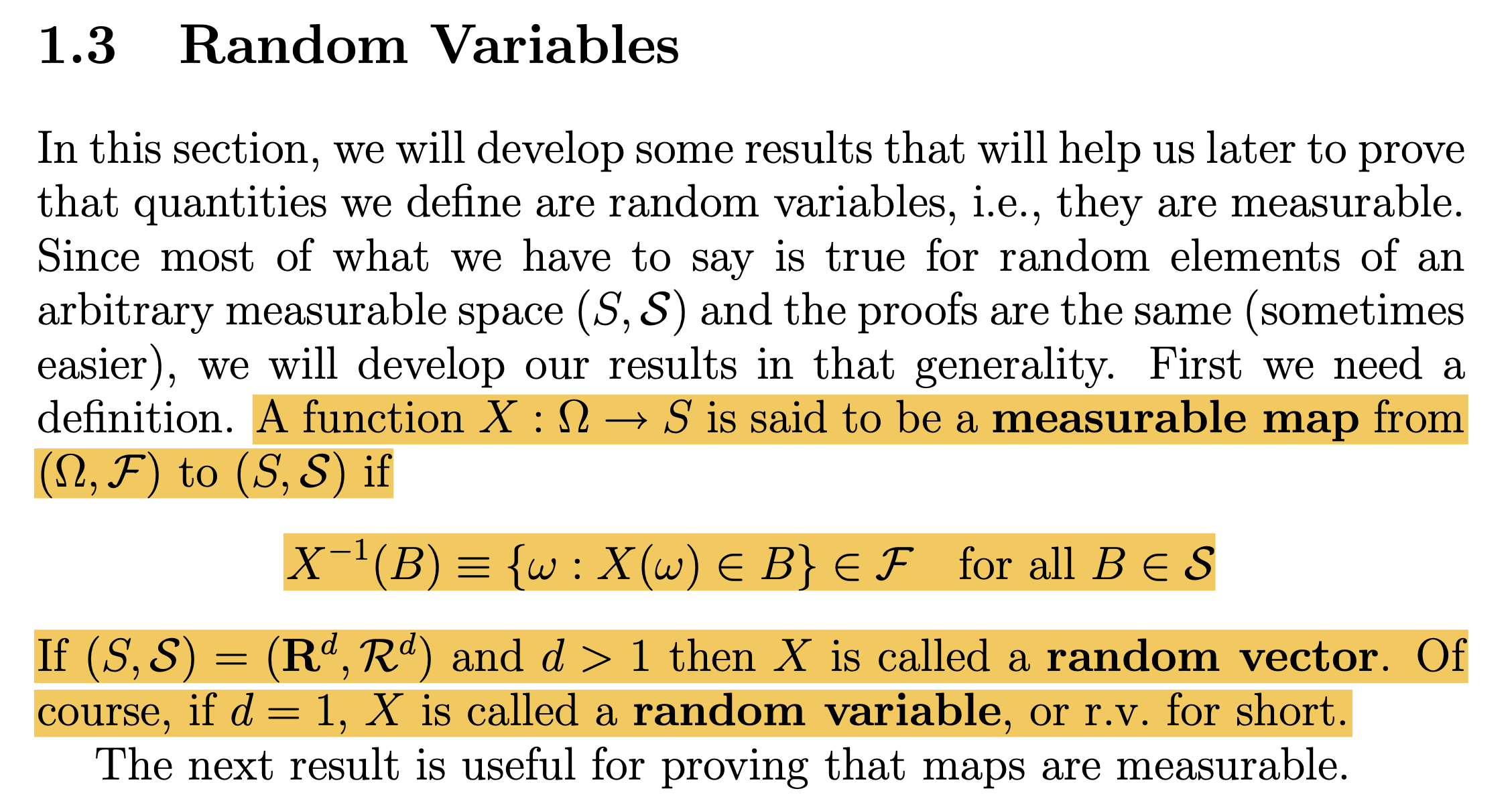 - 측도의 개념을 정의하고 그 특수한 케이스로 확률측도를 정의하였듯이, 잴 수 있는 함수(measurable map)라는 개념을 정의하고 그 특수한 케이스로 확률변수(혹은 확률벡터)를 정의한다.